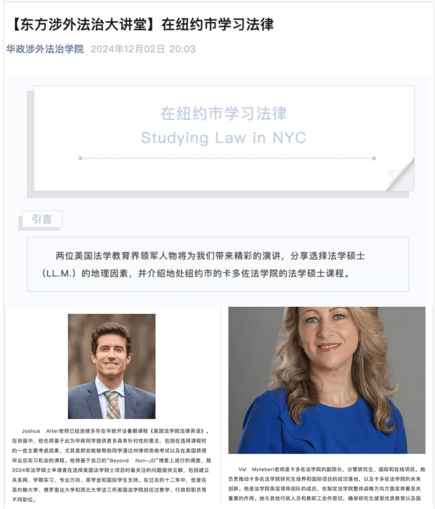 On December 4, 2024, I had the pleasure of joining Cardozo Associate Dean Val Myteberi for her session on “Studying Law in NYC” with colleagues at East China University of Political Science and Law (ECUPL).