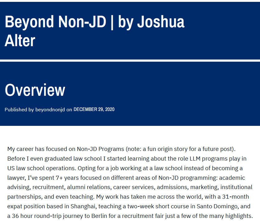 Given 4.5 years of posts and articles, I’ll move away from many of the themes that I’ve already covered extensively. And given the amazing new voices in the LL.M. world, I do not have to spend as much time talking about the student experience. It is far better to hear directly from LL.M. graduates and LL.M. students, to hear their perspectives and insights.