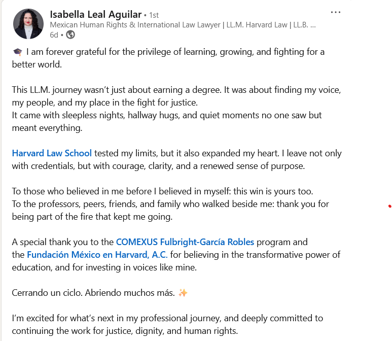 These projects are yet to be announced, but I am happy to share that I will be working on international human rights issues in Mexico, and, hopefully, in academia. In other words: I will be spending my time as an advocate, as a lawyer, and, God willing, as a professor.