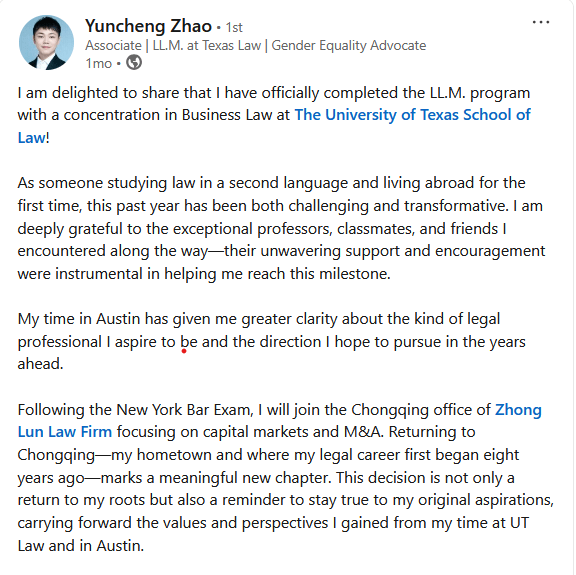 Thank you to Yuncheng Zhao for sharing so much great information! To learn more about this new series, please check out the LL.M. Spotlight Series page. Have great advice and a great story to share? Reach out!