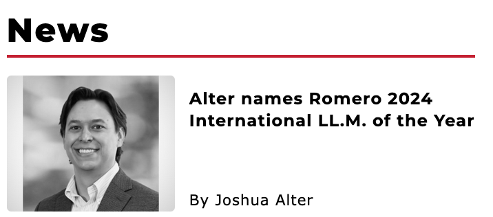 Alter Names Romero 2024 International LL.M. of the Year, International Jurist, December 6, 2024, https://nationaljurist.com/international-jurist-news/alter-names-carlos-romero-2024-international-ll-m-of-the-year/.